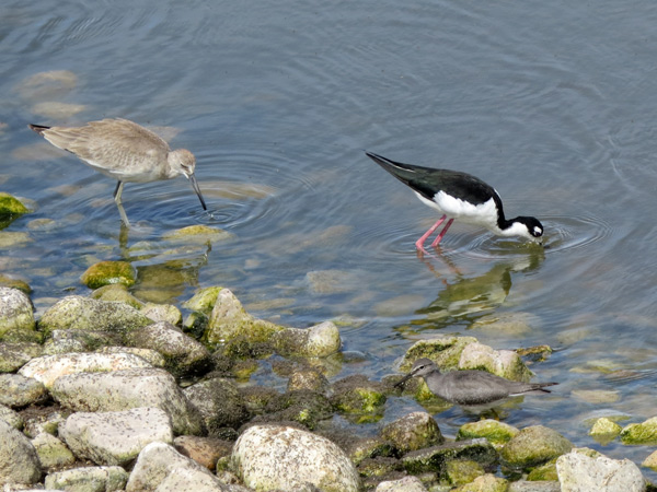 Wandering Tattler in the middle, Black-necked Stilt on the right |