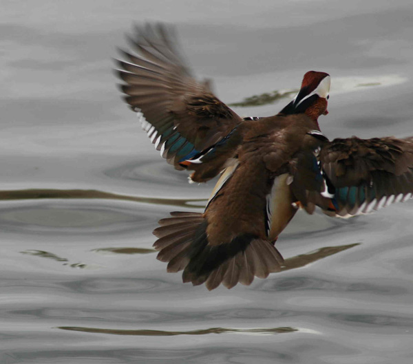 Mandarin Duck and a Family of Goose Hybrids 4 Feb 2006 E-mail from David Wheeler: There has been a gorgeous male Mandarin duck for at least two or three months in the Jordan River about a half block south of the Day-Riverside Library in Salt Lake City. Though not accepted as an established species on the Utah list, he is aesthetically a real treat, and allows people to get real close for wonderful photos. He hangs out right where the river swings closest to the road approximately 950 North and VERY approximately 1500 West (first street east of the library). Also there is a family of goose hybrids (domestic goose x Canada goose, along with both parents). I was not aware that these species could successfully breed together (seeing as they are not even of the same genus, let alone species). They are an interesting cross between the parents. Photos by David Wheeler |