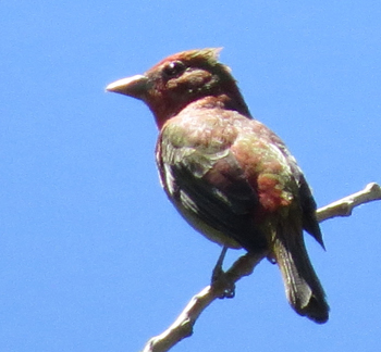 | The Summer Tanager was another fun lifer for me. I had been looking for the bird where it had been reported on the Spanish Fork River, for about an hour. I had been calling the bird so often that I had the call ingrained in my noggin. I had decided to head back to the car for a drink and then I was going to head the other direction from where it was found. As I was just heading out I got a call from Suzi Holt and she let me know that they were on their way and would be there shortly. I figured that shortly meant 20 minutes not 2. They arrive so fast that I hadn’t even had the chance to try for the bird again. When Suzi arrived she was with her young daughter and Steve Clark. They asked me if I had had any luck and I told them that I could show them where it wasn’t. I said that I wanted to try to the North. We all started down the path and began to play the call. I heard the bird return the exact same call I had been playing less than 10 minutes after we started. I said to Suzi, “I think that’s it” She heard it too and agreed that we were right on top of the bird. Suzi was the first to see it. They had the Summer Tanager for their UCB challenge and I had a Lifer for mine. |